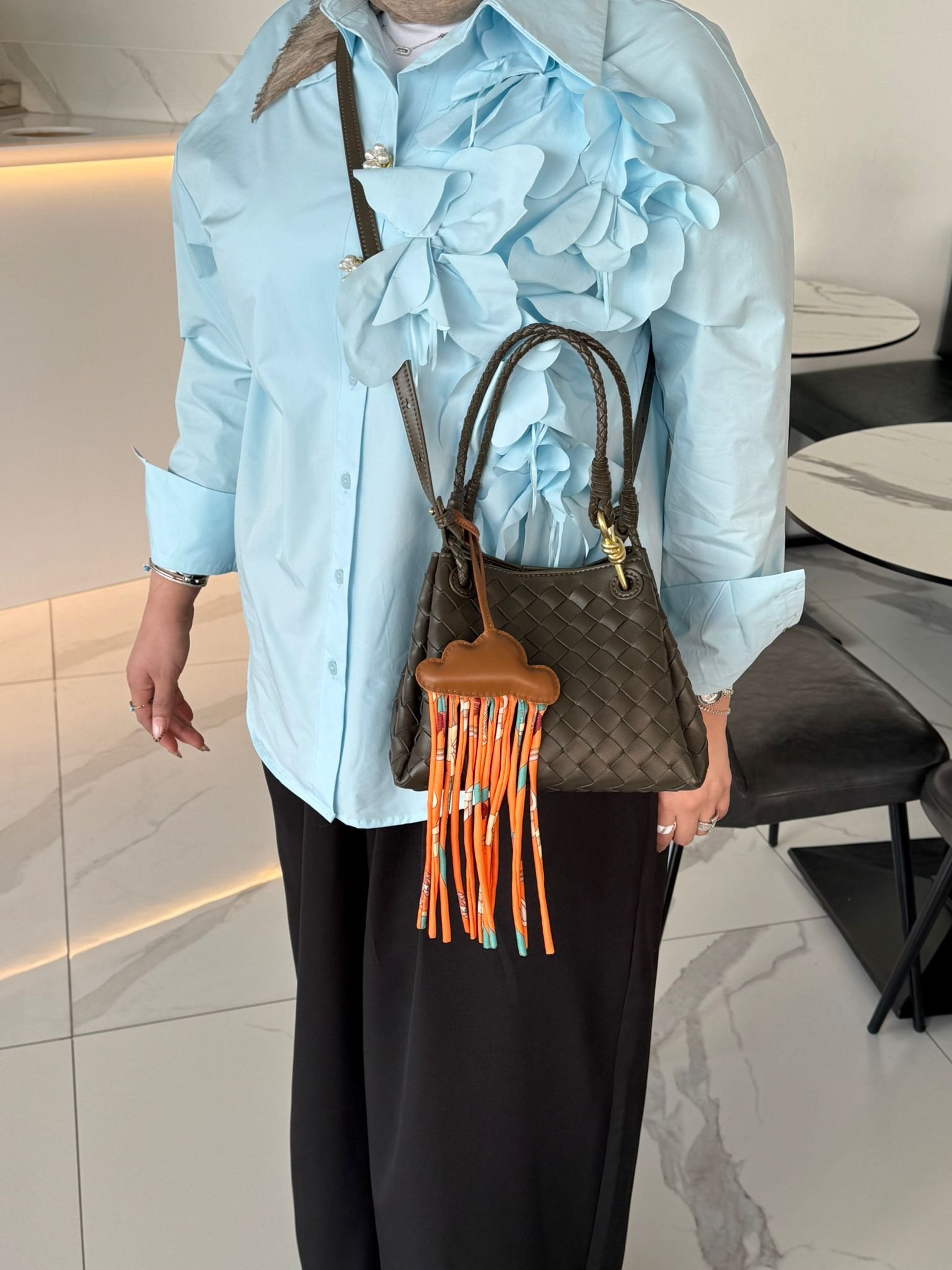 جنطه جلد لون زيتي غامج مع بوك داخلي وستراب سايز ٢٢سم