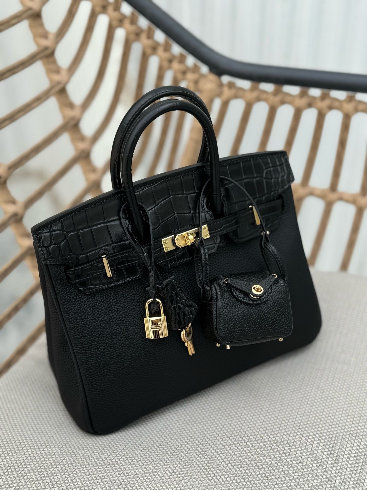 جنطه مكس جلد توقو وكروكو سايز ٢٥سم لون اسود قولد هاردوير بدون ستراب