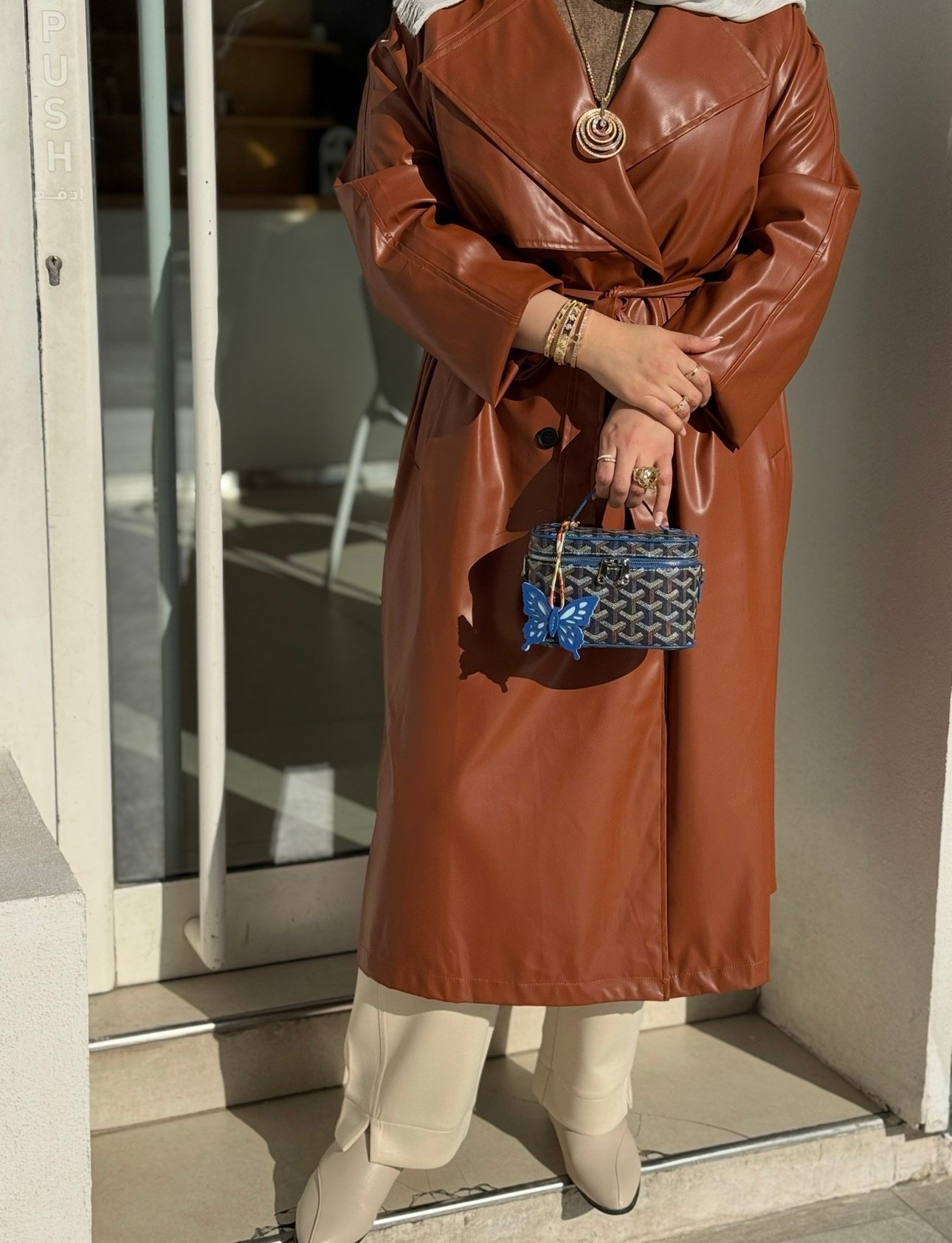 جنطه جلد لونها اسود مع ستراب واطراف زرقاء